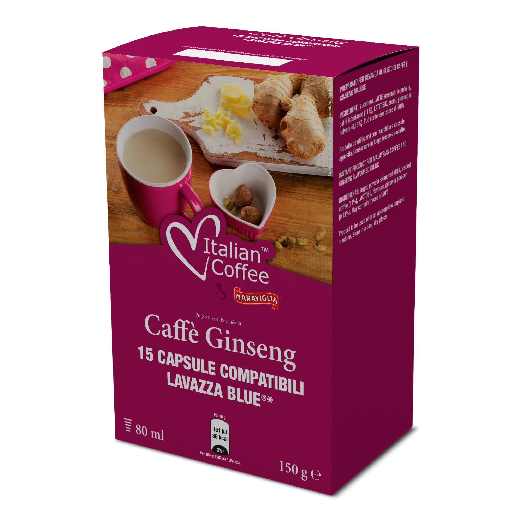 Ingredienti | Zucchero, LATTE scremato in polvere, caffè istantaneo (11%), LATTOSIO, aromi, ginseng in polvere (0,13%). |